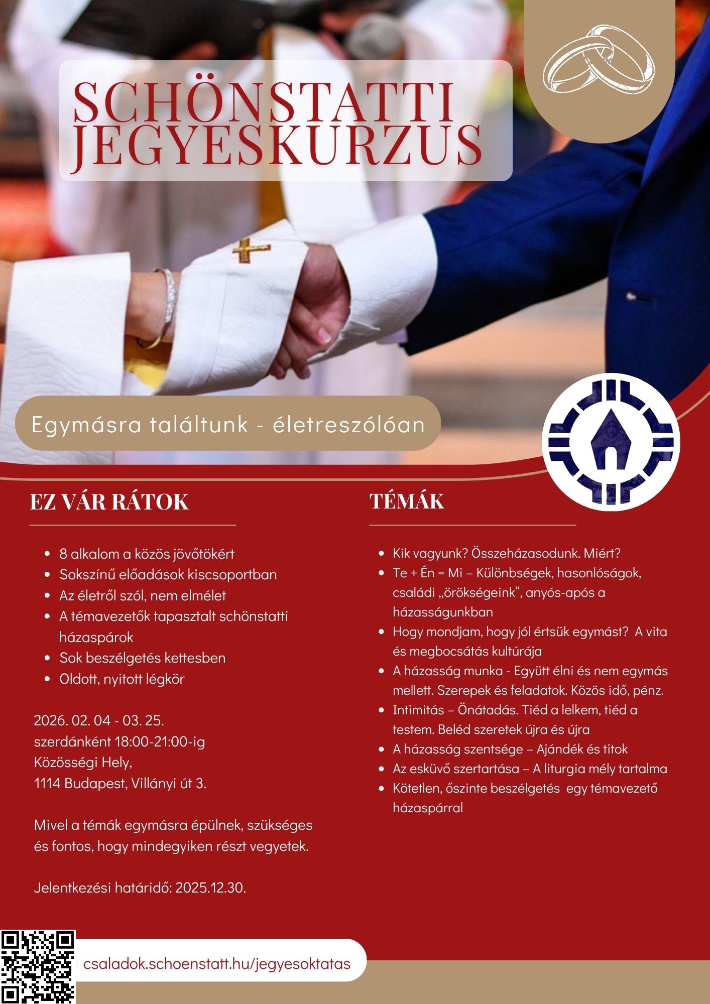 Szeretettel várunk Benneteket jegyeskurzusunkra, ahol tapasztalt házaspárok vezetésével szeretnénk nektek támogatást és útmutatást adni a közös életetekhez. A felkészülést csoportos formában, nyolc alkalommal tartjuk schönstatti házasok közreműködésével.
